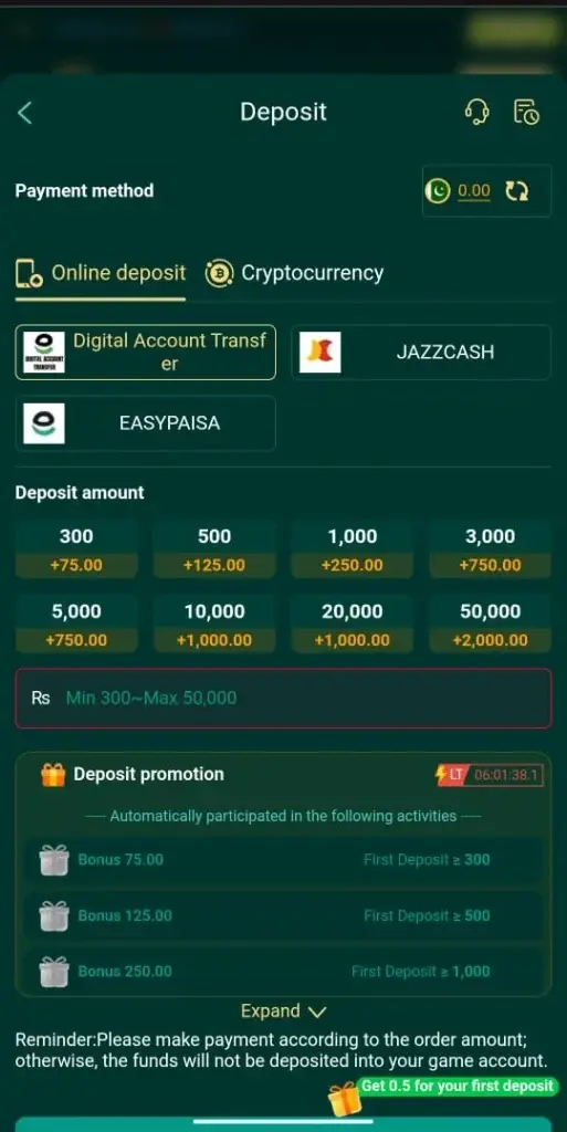 Most users can use Easypaisa, JazzCash, or bank transfers to deposit and withdraw funds easily.